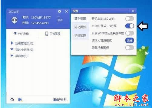 3、因为这里不使用独立的驱动和随机启动软件,所以这里不蓝屏,可以打开该软件,取消自动打开WiFi分享。