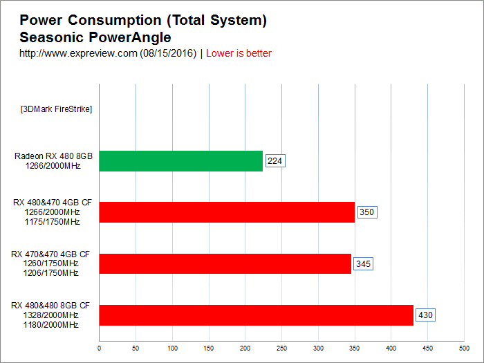 RX 480&470 CF在测试大部分项目的时候,双卡都能以高负载状态运行,不过由于存在TDP机制的限制,频率稍微有所降低。混合交火在跑3DMark FireStrike循环测试的时候,和RX 470 CF双卡的整机功耗差距不大,整机功耗都是350W左右,而RX 480 CF双卡整机功耗直接飙升到430W,不过相对上一代的Hawaii核心,优秀的功耗控制使得功耗降低了不少。