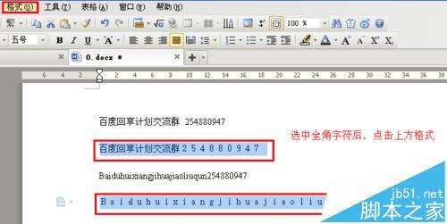 1、在文档中选中需要转换的全角字符,然后点击上方菜单“格式”。