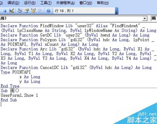 3、模块编程。在模块1内编程,声明5个函数、1个结构,并编写一句显示窗体的程序——“画”。