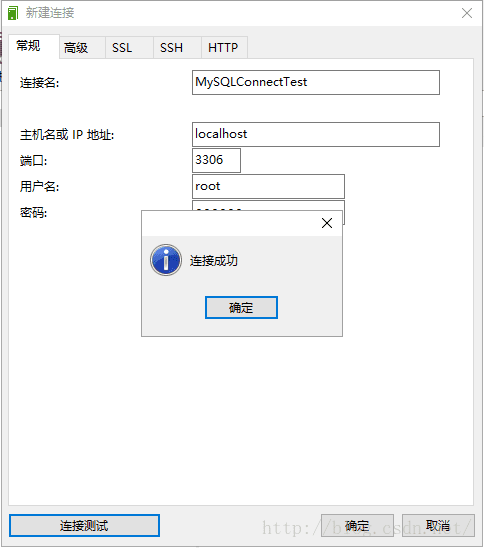 3. 点击“连接测试”按钮,弹出连接成功对话框即表示mysql server已开启