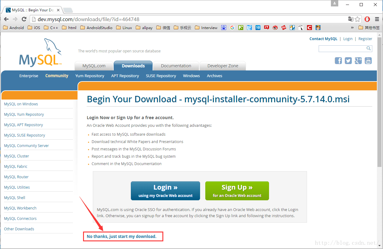 7. 这个页面告诉询问你是否登录,告诉你登录之后有哪些好处,我们不登录,点击页面底部的“No thanks, just start my download.”按钮进入下载页面