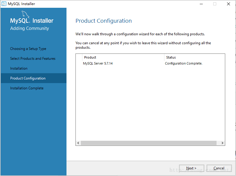 5. 点击“Execute”(执行)开始安装,安装过程中会显示安装的Progress(进度),等待安装完成后Status会显示Complete,mysql图标前会出现一个绿色的勾,然后点击“Next”按钮进入产品配置界面