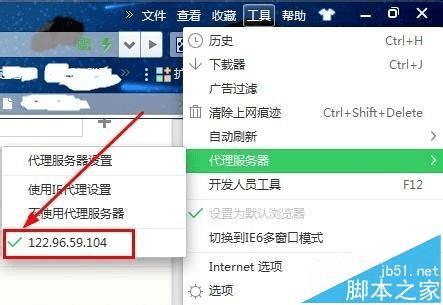3、最后,在“工具”的“代理服务器”中,点击选择新添加的“122.96.59.104”即可。
