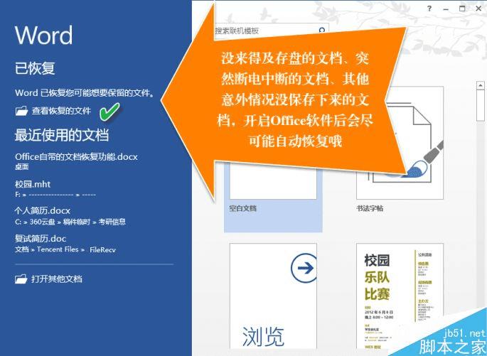由于编辑过程中偶遇的断电、死机或办公软件进程意外中断所造成的文档未被及时保存,下此启动编辑软件后,软件会自动提醒上次出错的情况,并提示已经自动恢复和修复的文档信息列表。可点击“查看恢复的文件”链接查看。