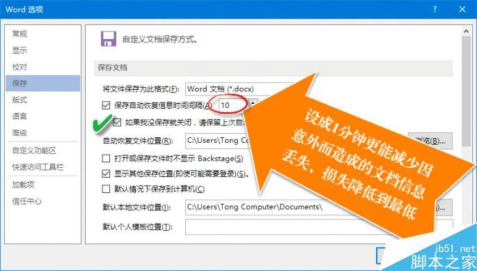 通过在Office软件的“选项”窗口中设置开启自动保存功能并设置自动保存的时间间隔,缩短自动保存时间(如1分钟),尽可能保存最多的文件信息。此外,请选中“如果我没保存就关闭,请保留上次自动保留的版本”复选框。