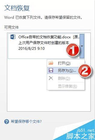 进入文档恢复对话框,会显示所有可恢复文件的文件名清单,点选需要恢复的文件,点击文件右侧的下拉菜单按钮,选择“另存为”保存文件,或选择“打开”直接打开该文件。