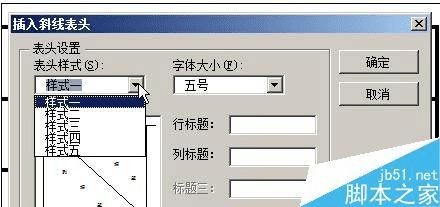 步骤五:在斜线表头的设置窗口可以设置斜线表头样式,字体大小和标题文字,共有五种斜线表头样式可供选择,区别在于斜线数量和绘制方式。选择表头样式会显示出预览。