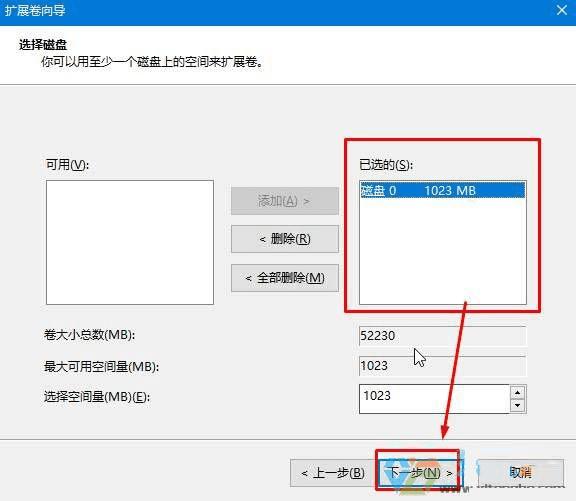 6、打开后会自动选定已有的可用空间,点击下一步即可