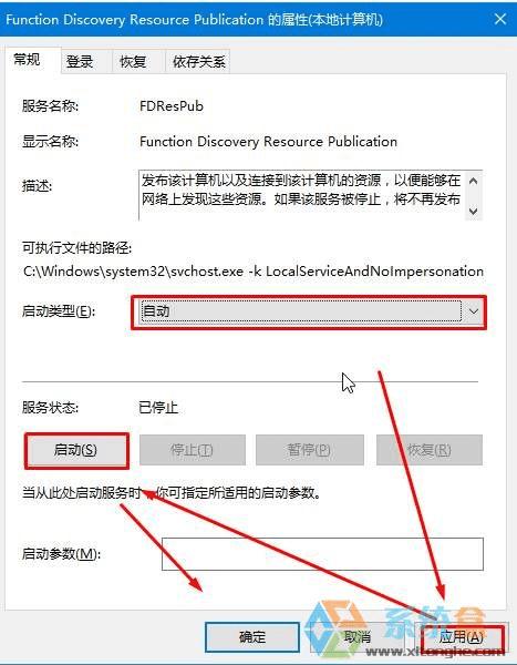 2、双击打开“Funtion Discovery Resource Publication”,将其启动类型修改为“自动”,点击应用,点击启用,点击确定;