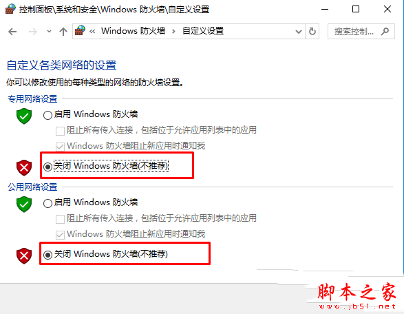 5、然后专用网络和公用网络都设置为 关闭防火墙;