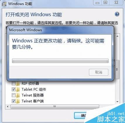 4、然后,点击确定,会弹出一个windows正在更改功能的提示框,等待提示框中的进度条走完,这个需要几分钟的时间,大家耐心等待埃
