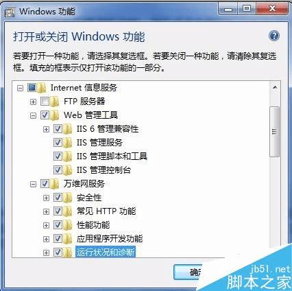 打开或关闭windows功能处,一定要将所需功能选择完毕,不知道具体要哪个的话,就将internet信息服务全选