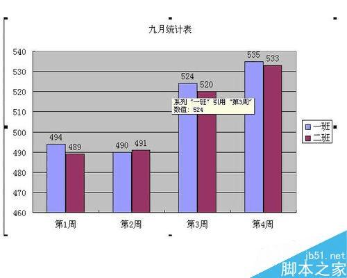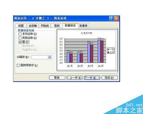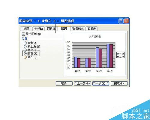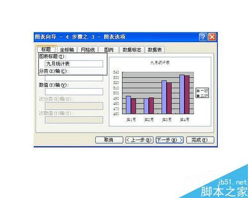 4、设定图表选项。图表选项——标题——在“图表标题”框中输入“九月统计表”——图例-——示图例——数据标志——设定“值”——下一步;在右侧有个预览区,可以随时看到操作过程结果