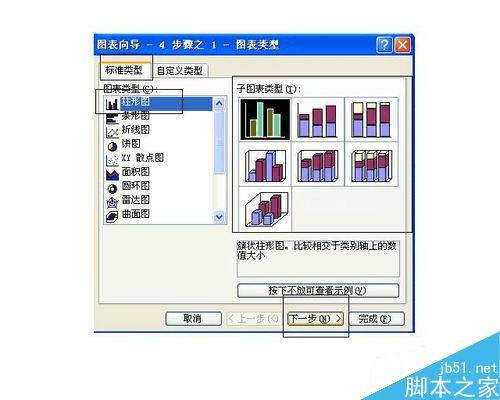 2、选定图表类型。单击常用工具栏的“图表向导”(或点击菜单“插入”|“图表”,打开“图表类型”对话框)-标准类型-柱形图-子图表类型-下一步