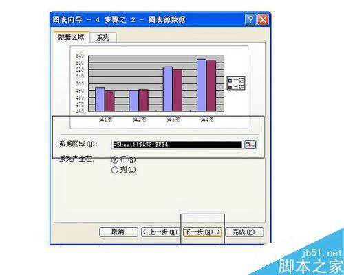3、设定所需数据源及设置系列产生方式,由于我们事先以选定了数据源,因此在“数据区域”以自动填入相应区域值(或者将要制作图表的区域进行选择,可在”“数据区域”填入区域值),设置“系列产生在”为“行”点击下一步。