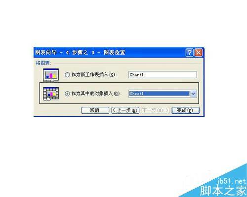 5、选定图表位置。图表位置——作为其中的对象插入-单击“完成”