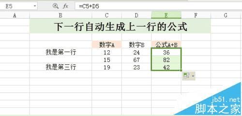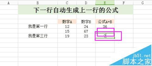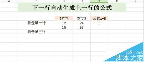 2、填充第一行的数据,数字A=12,B=24,那第三列A+B=36,如下图的数据显示情况。