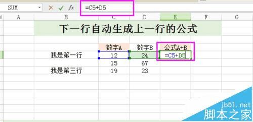 4、在第一列第三个格子里,可以填上你想写的公式。本文是求和=C5+D5,如下图的公式显示和运行。也可以根据你想要的运算进行公式的书写。