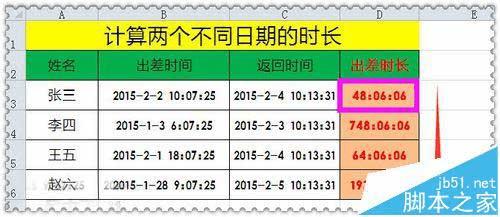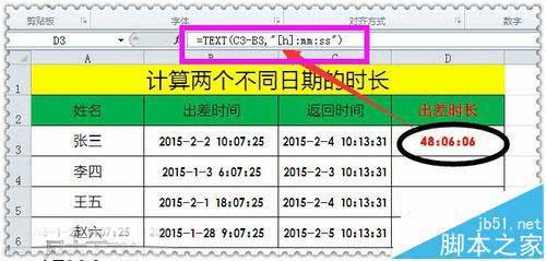 6、函数说明:用返回时间减去出差时间,得出两个不同时间的时间长,用TEXT函数设置出时间的显示格式;其中h表示小时、m表示分钟、s表示秒;
