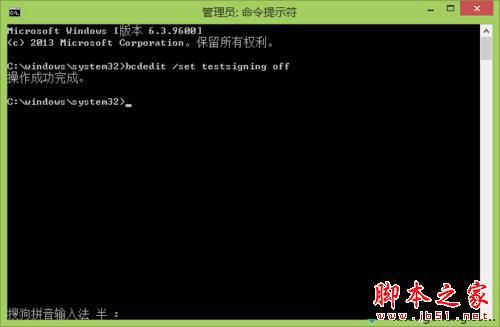 2、在“命令行提示符”输入"bcdedit /set testsigning off"回车,然后命令行提示符会显示“操作成功完成”,就可以关闭windows测试模式了。
