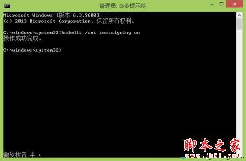 2、在“命令行提示符”输入"bcdedit /set testsigning on"回车,然后命令行提示符会显示“操作成功完成”,就可以打开windows测试模式了;