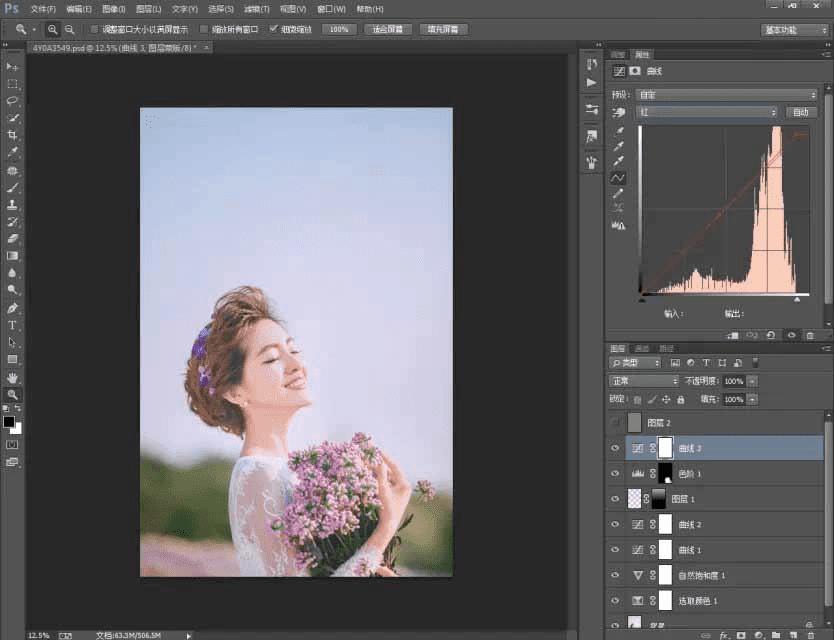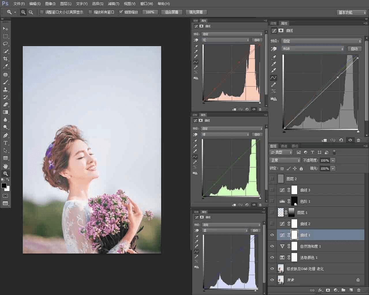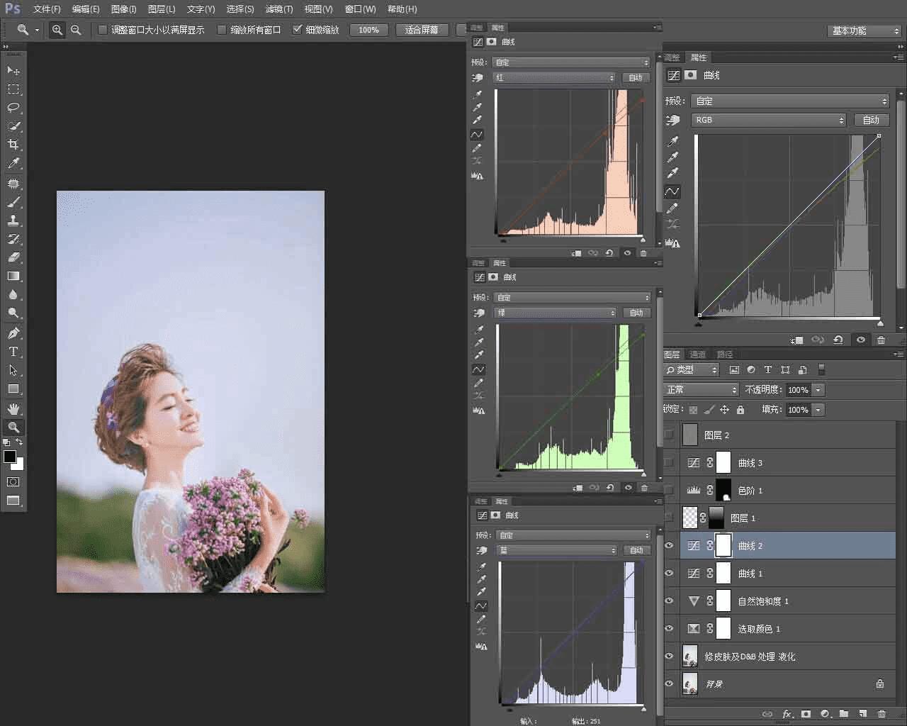 9、再次调整曲线,高光加适量蓝暗调加适量绿。