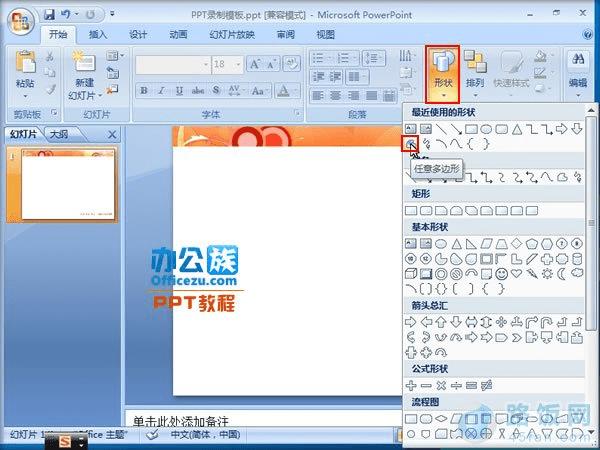 1、 启动PowerPoint2007,插入一个任意多边形,单击菜单栏--插入--任意多边形即可。