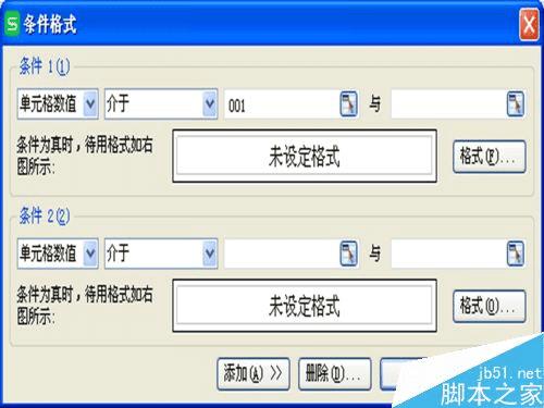 3、执行格式-条件格式命令,在弹出的对话框中设置单元格数值等于001.