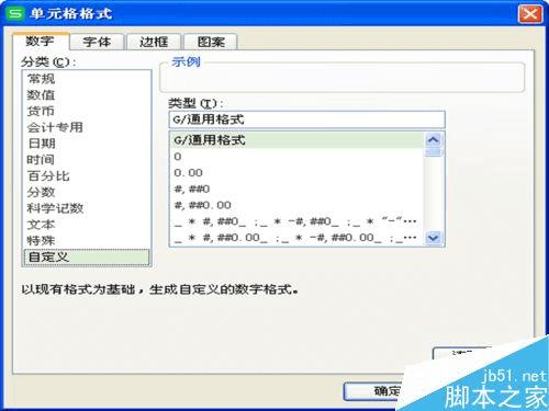 5、在单元格格式对话框中,在分类中选择自定义选项。
