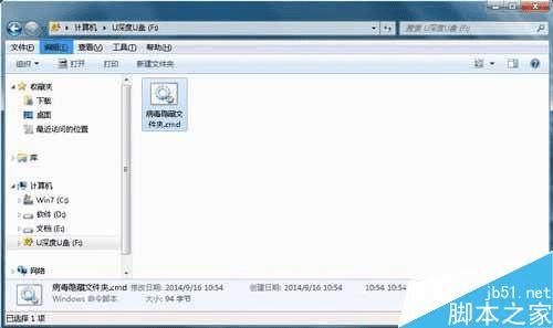 再将桌面上的“病毒隐藏文件夹.cmd”文件拷贝到u盘里面,并且双击它,如下图所示: