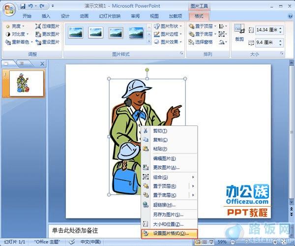 1、 选中需要添加倒影的图片,单击鼠标右键,在弹出的列表中选择“设置图片格式”命令。