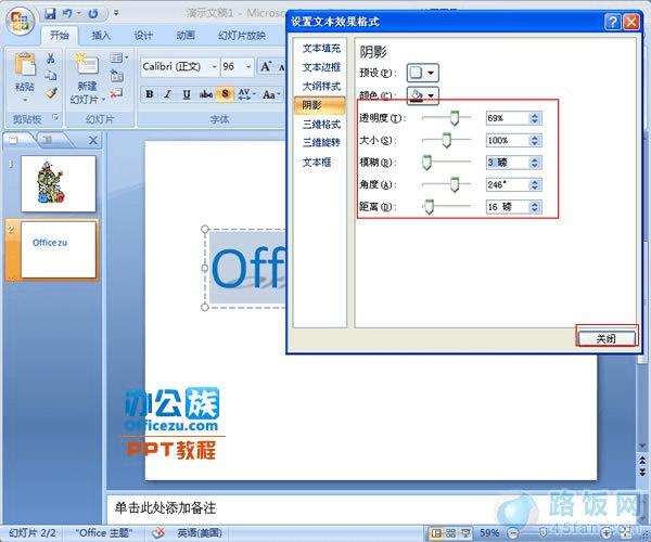 3、 在“阴影”选项卡下对阴影的“透明度”、“大小”、“模糊”、“角度”、“距离”项进行调节,然后单击“关闭”按钮即可.