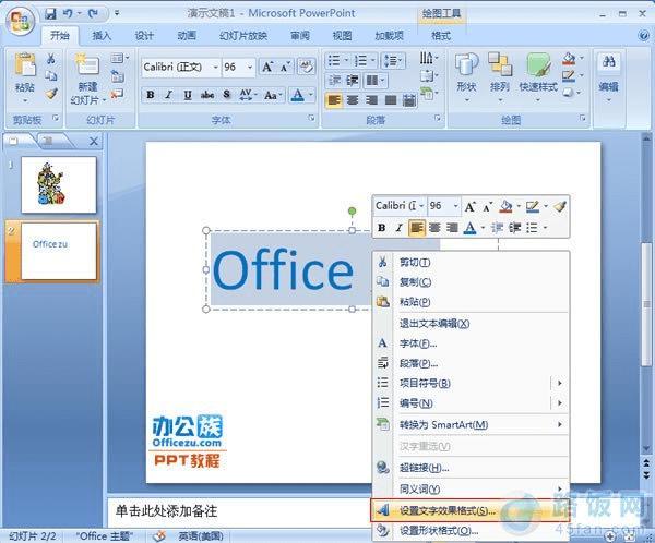1、 选中需要添加倒影的文字,单击鼠标右键,在弹出的列表中选择“设置文字效果格式”命令。
