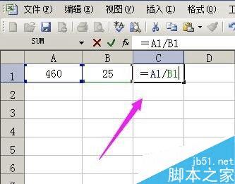 如图中所示,A1单元格为460;B1单元格为25;两数相除,得数要显示在C1单元格。