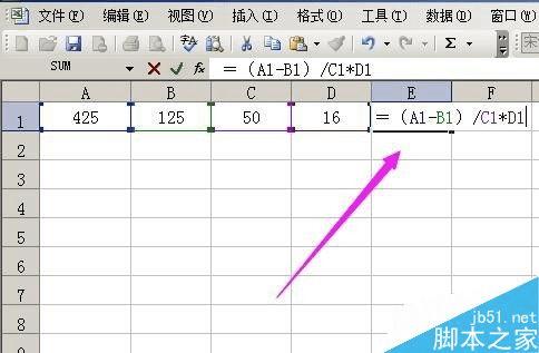 混合计算是:425-125再除以50然后乘以16,得数显示在E1单元格;