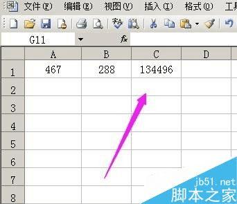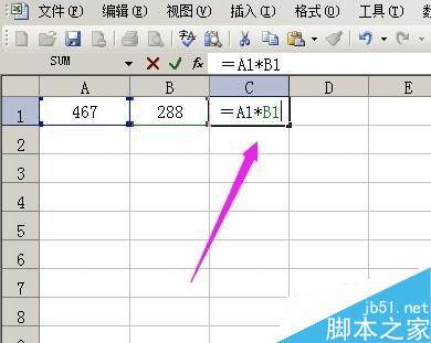 如图中所示,A1单元格为467;B1单元格为288;两数相乘,得数要显示在C1单元格。