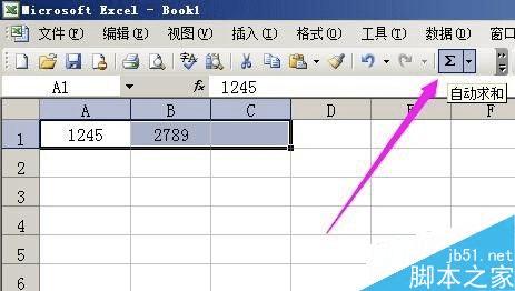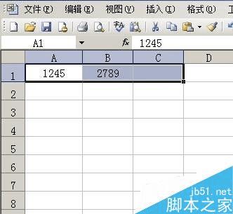 如图中所示,把A1单元格1245与B1单元格的2789相加,得数显示在C1单元格。