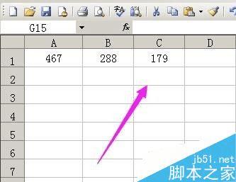 如图中所示,A1单元格为467;B1单元格为288,两数相减,得数要显示在C1单元格。
