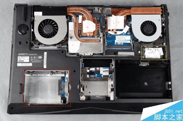 以上图为例,打开电脑后盖,露出电脑自带的原装硬盘,即图中黄框部分,然后仔细地将其固定螺丝一一取下,便可拔下硬盘,然后将新买的SSD装上即可。意的是,安装硬盘后需要拧紧螺丝,以防硬盘脱落。同时也需要注意,SATA硬盘大多数是插拔式的,安装时请勿从根部向上提起,以免损坏接口。