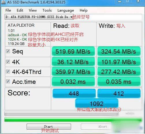 2、安装后,打开AS SSD,然后点击下方的「Start(开始)」就可以检测出固态硬盘读取速度、是否4K对齐、是否开启AHCI模式等,如下图所示。