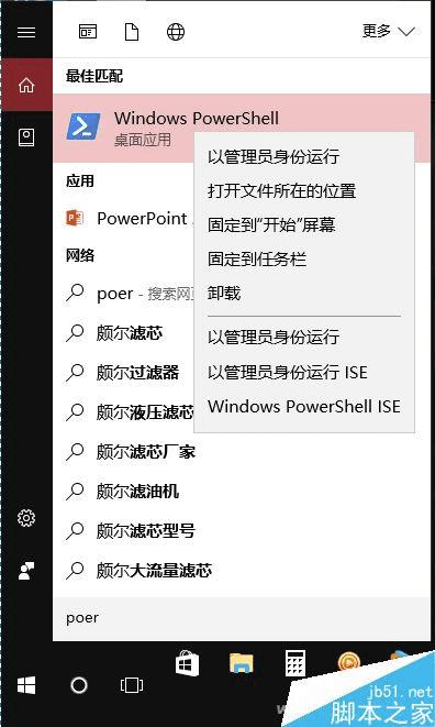 在Cortana中搜索“”Windows powershell”,用右键”管理员模式“启动,