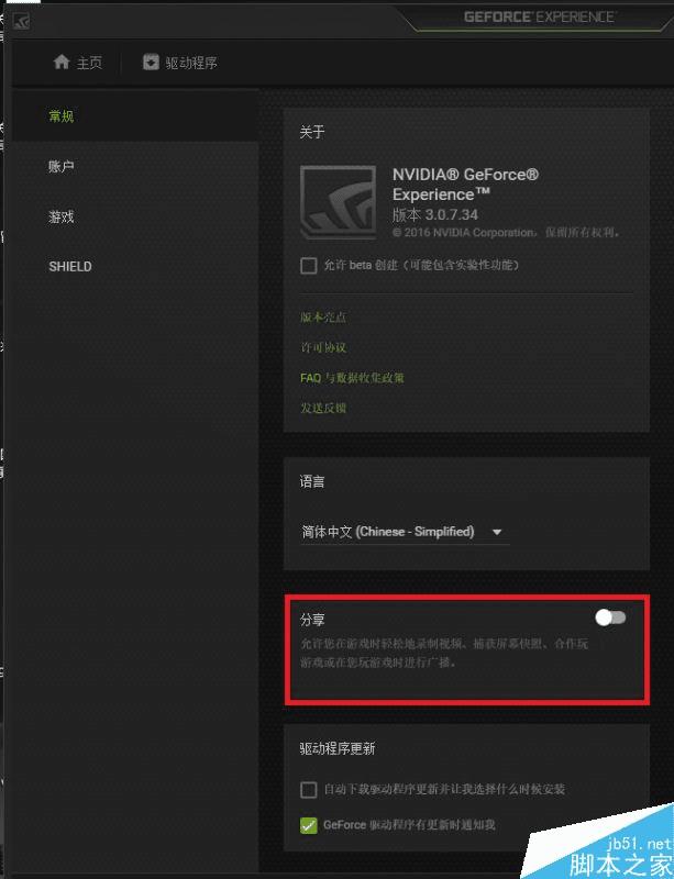 要是你用了Nvidia的显卡又安装了GeForce Experience驱动软件,会发现在游戏的右下角会有个小喇叭的图标,它是Nvidia显卡驱动中自带的录制功能,建议也关掉,就在GeForce Experience的设置中,分享那个选项,对系统资源的占用也不小的说!