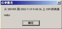如下图所示,为发送到客户机上的信息为Hello!,发送时间为2002年7月19日9点48分36秒。