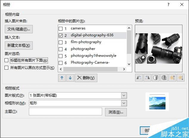此时在中间列表中选中某张照片,可以通过上下箭头铵扭调整图它在整个幻灯片中的位置,或者也可以删除不合适的照片,以及添加新的照片等。下方还可以设置图片的版式,比如让照片满屏显示,或者照片带标题等。相框的形状也可以有多种选择。