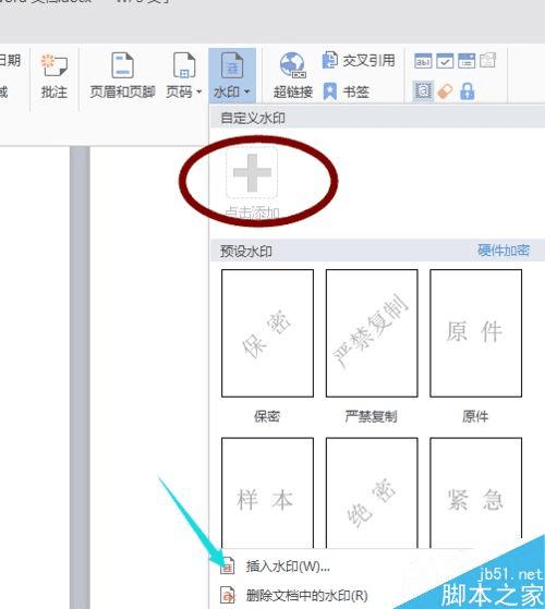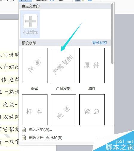 3、点击水印后会出现下拉,这里有预设的水印,也可以自定义水印,首先点击预设水樱这样点击任一水印后,在文档中就会显示了。