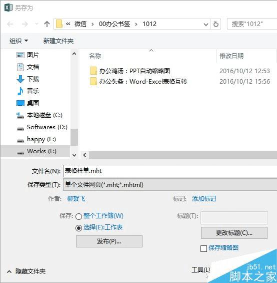 在打开的另存对话框中,选择保存类型为“单个文件网页(*.mht;*.mhtml)”,并在下面点选“选择(E):工作表”。