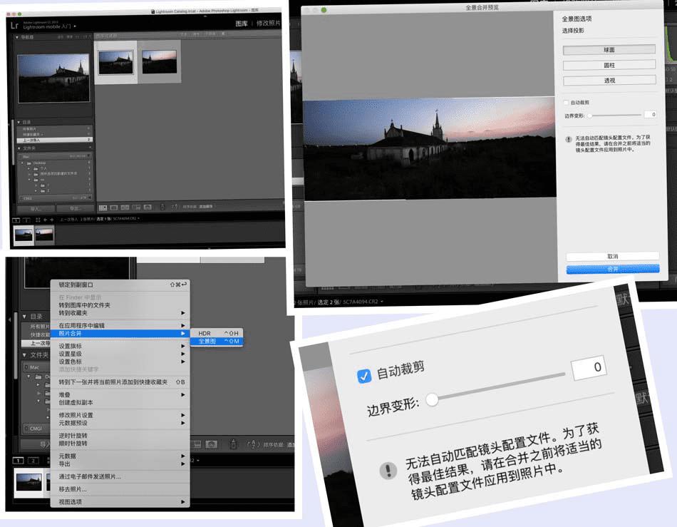 由于用的17移轴接片,先在Lr里面把两张图片接成一张,Lr自带接片功能。因为图片周边没有规则的线条,所以我把自动填充选上了,不建议城市建筑片选这个选项。