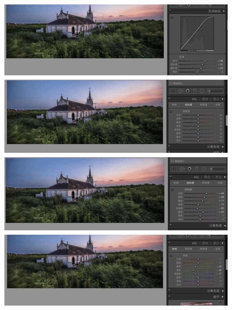 图片整体调亮后,整个片子会有点发灰,这个时候调整曲线和颜色来改善。曲线高光部分很少,所以加了很多高光,这样整个明暗对比就出来了,颜色部分由于是黄昏所以在色相里面把绿色往左偏,显的绿植稍微黄一点点,更加凸显气氛。