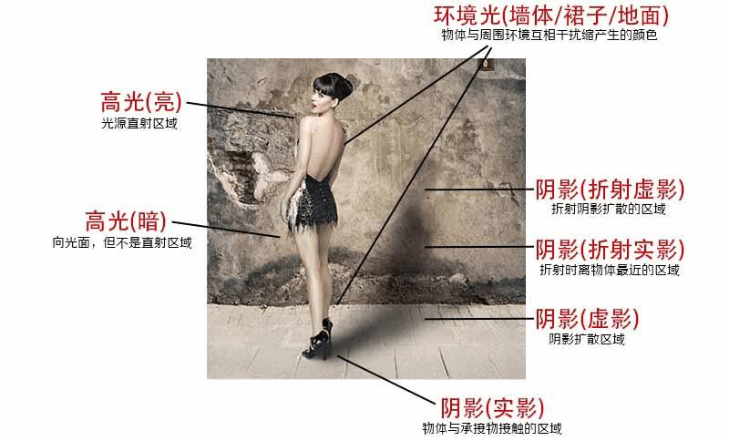 最后我们需要考虑光,光的塑造中包含光源位置、高光位置及亮暗、阴影走向及虚实、环境光颜色等等,光塑造的成功,作品中的诸多元素就会统一;我们做合成肯定会经历怎么看怎么假,但是找不到原因的阶段,这期间大部分情况下就是因为没有朔造合理的光造成的。光的朔造类似于素描中的明暗关系,有美术功底的朋友可能更易掌握,下图为例,一个美女扔进一个环境中: